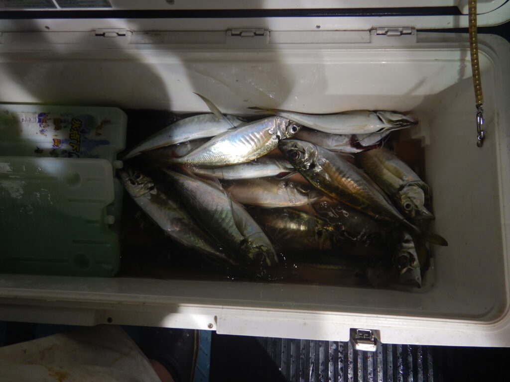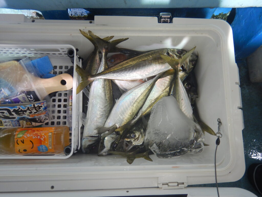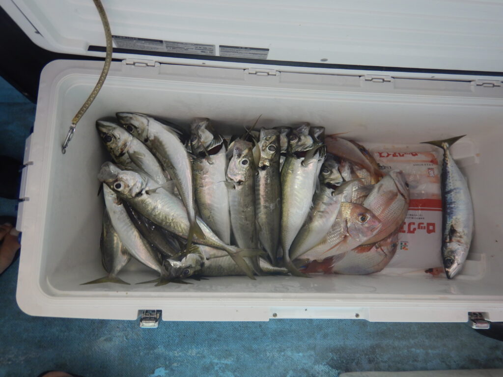 アジ(30㎝前後~40㎝ぐらい)130尾程 サバ10尾程 花鯛・真鯛(25㎝~37㎝)50枚程 、赤イカ・マイカ4杯