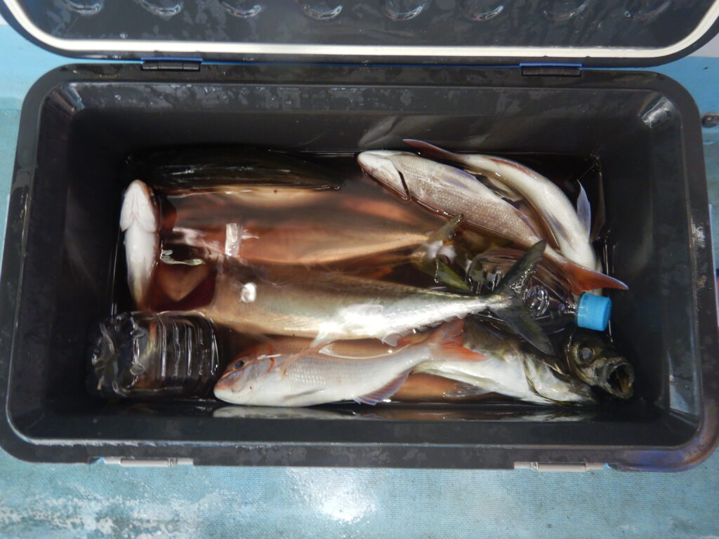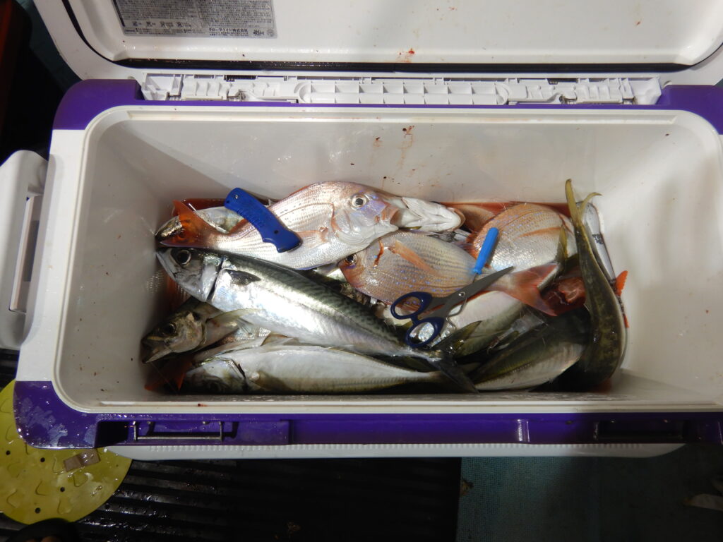 投稿日: 2025年8月24日 投稿者: 船長8月23日(土) ナイター便オオアジ釣り アジ(20㎝~44㎝)120尾程 サバ20尾程 花鯛・真鯛70尾程 ツバイソ数尾 チダイ37㎝ アジ44㎝ 今日は鯛がよく釣れました1人で鯛30枚程釣っていかれた釣人もおられました まだまだ夜のアジは釣れてますよ 貴新丸は釣人のご連絡お待ちしております