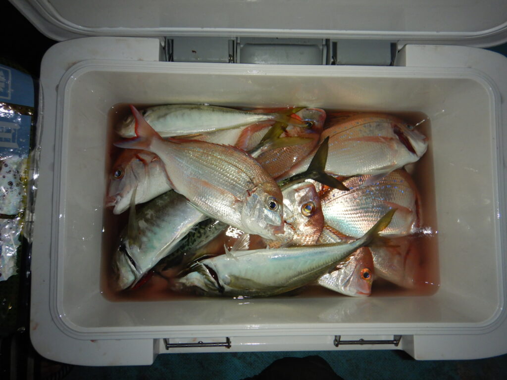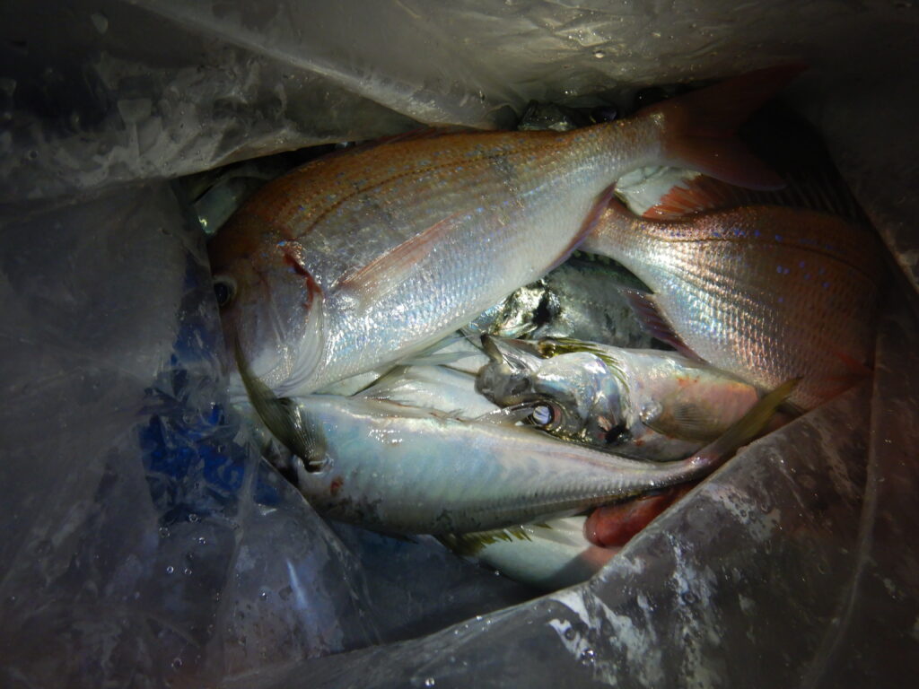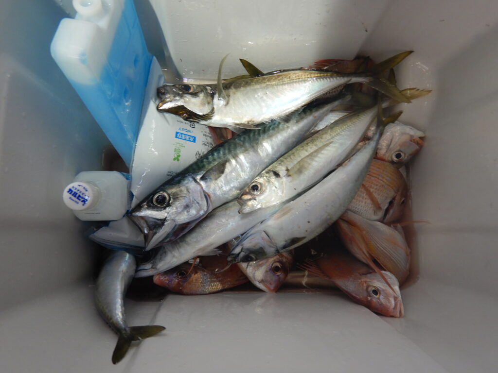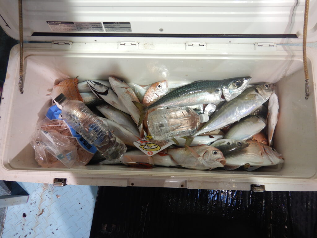 アジ(20㎝~37㎝)100尾程 花鯛・真鯛(20㎝~37㎝)110枚 サバ80尾程  イシモチ1尾 ツバイソ3尾