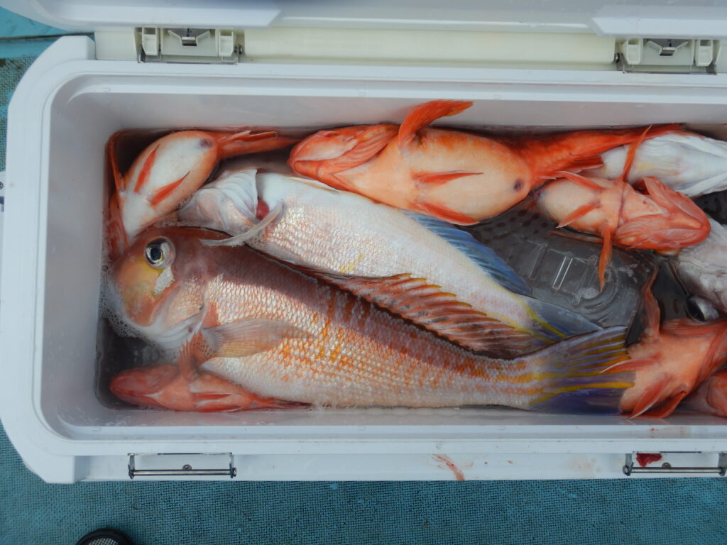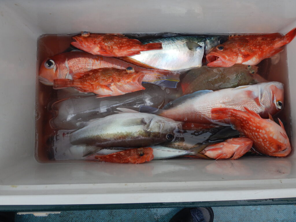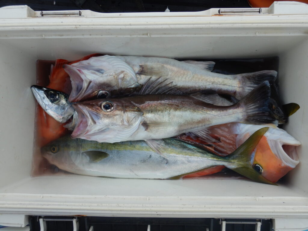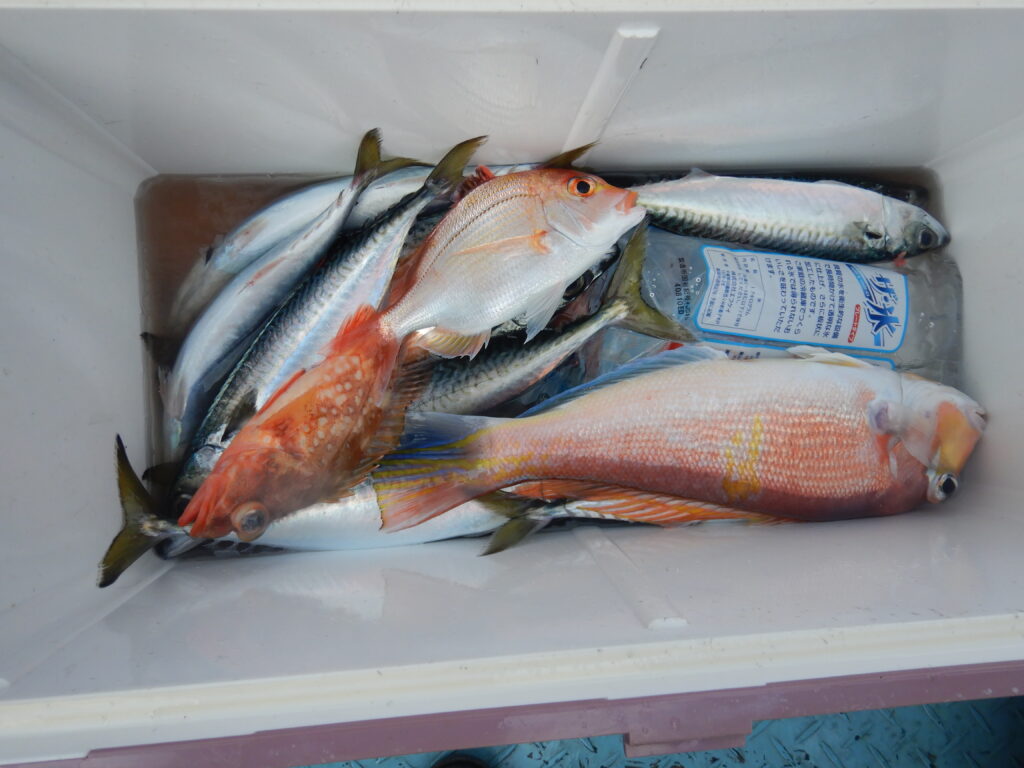 甘鯛(36㎝~43㎝)10尾 花鯛7枚 カサゴ15尾 サバ13尾 イナダ3尾 アジ5尾 アラ(32㎝~35㎝)5尾