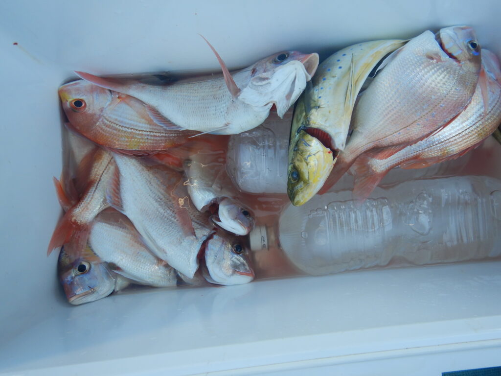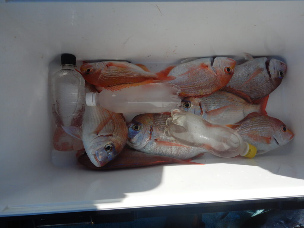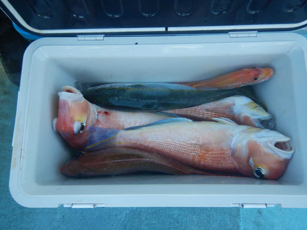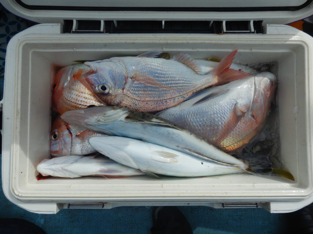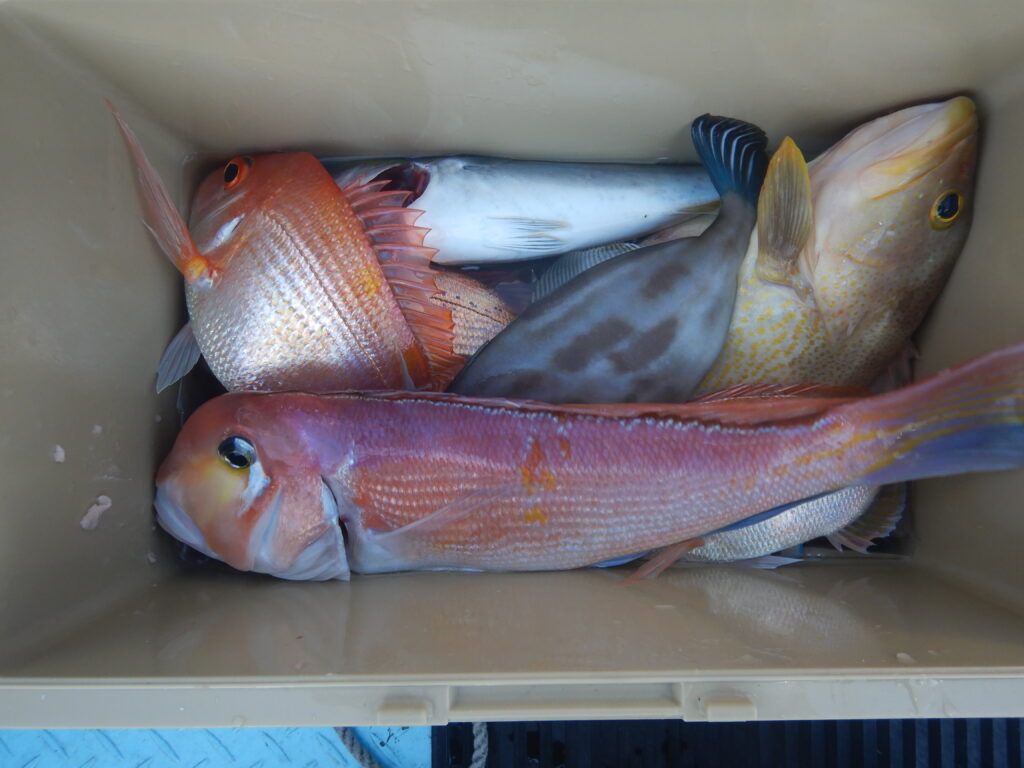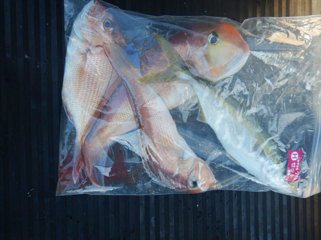 甘鯛(37㎝~45㎝)15尾 花鯛・真鯛30枚 イナダ10尾 サバ10尾 ウマズラ4枚 ハタ1尾
