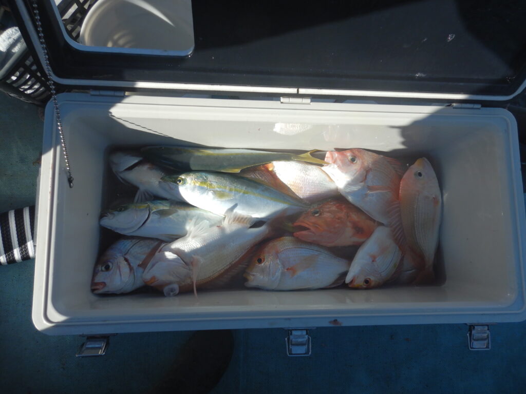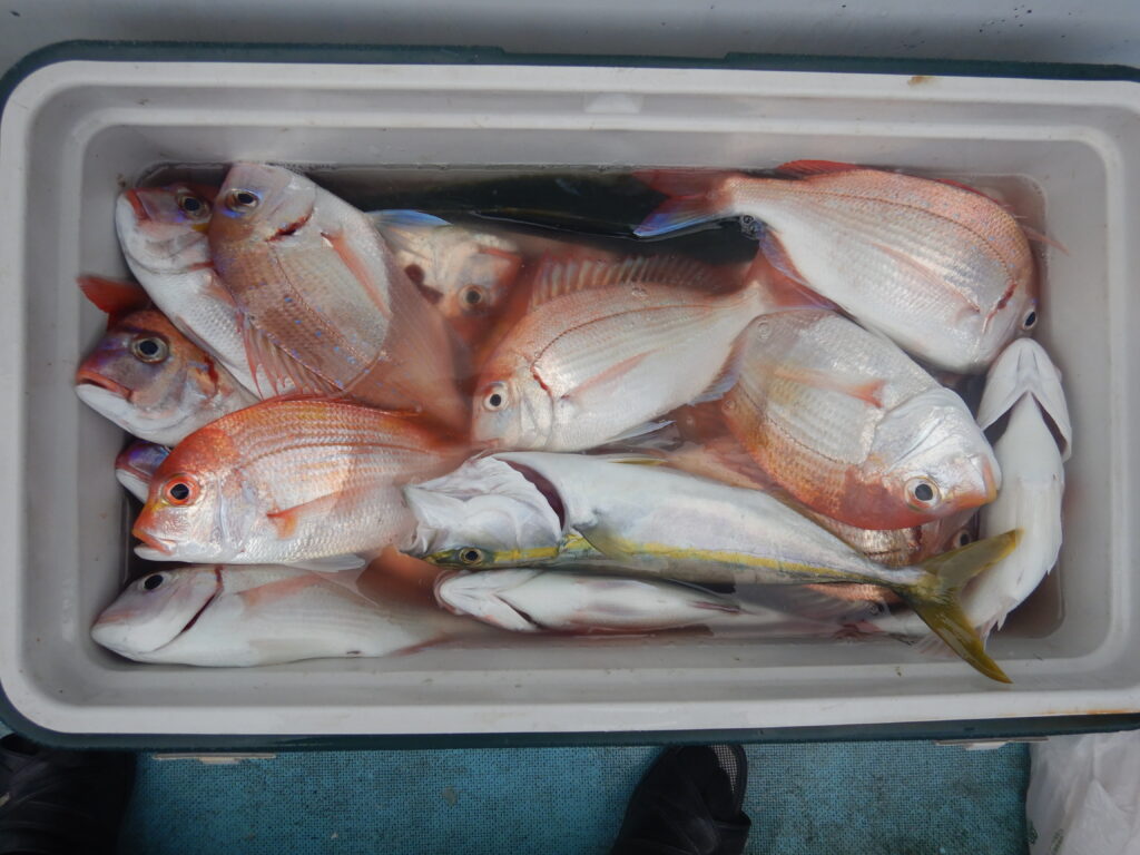 甘鯛2尾 花鯛・真鯛(25㎝~43㎝)140枚 イナダ15尾 ガンド1尾 カイワリ8枚 ウマズラ1枚 アジ(35㎝前後)5尾