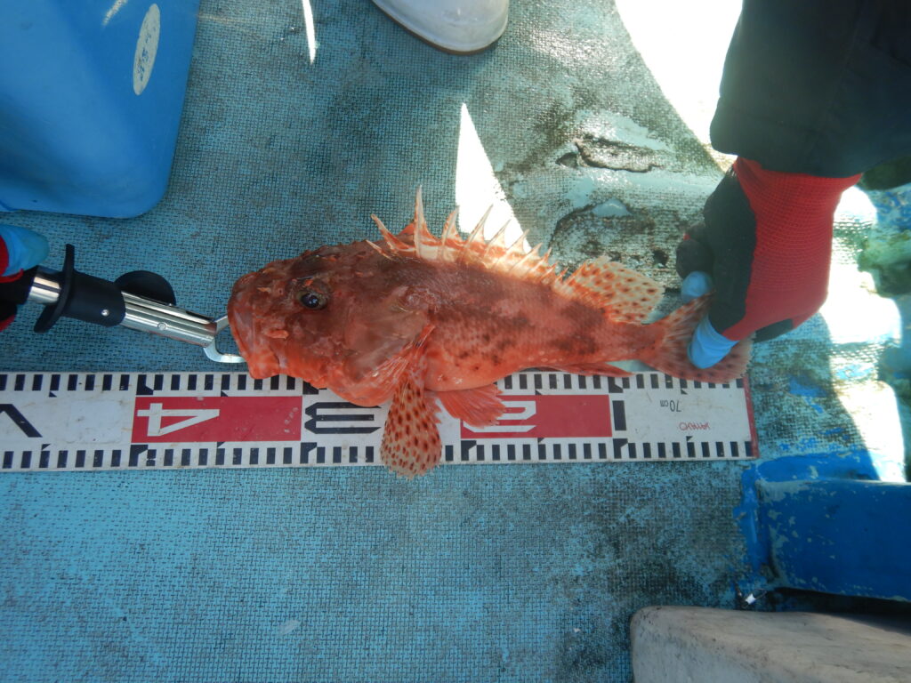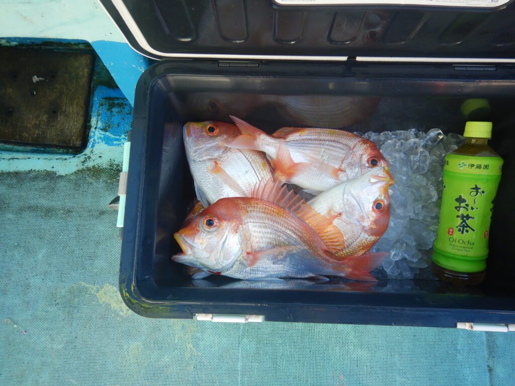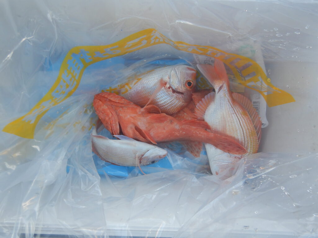 甘鯛(40㎝~47㎝)3尾 真鯛・花鯛(20㎝~35㎝)43枚 カサゴ4尾 鬼カサゴ(28㎝~33㎝) 2尾 イナダ4尾 カワハギ1枚