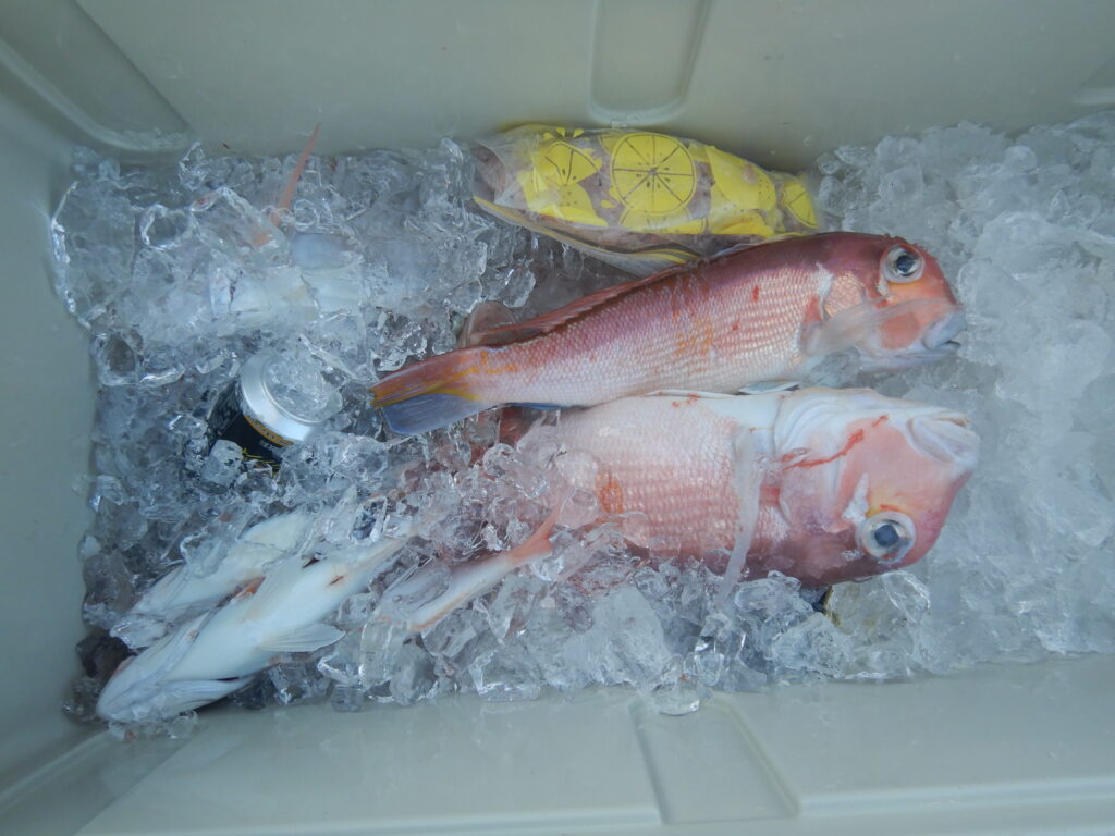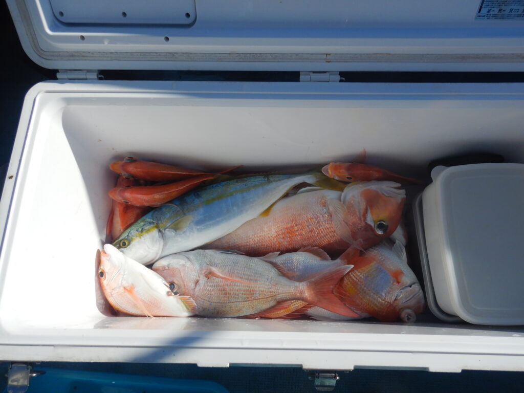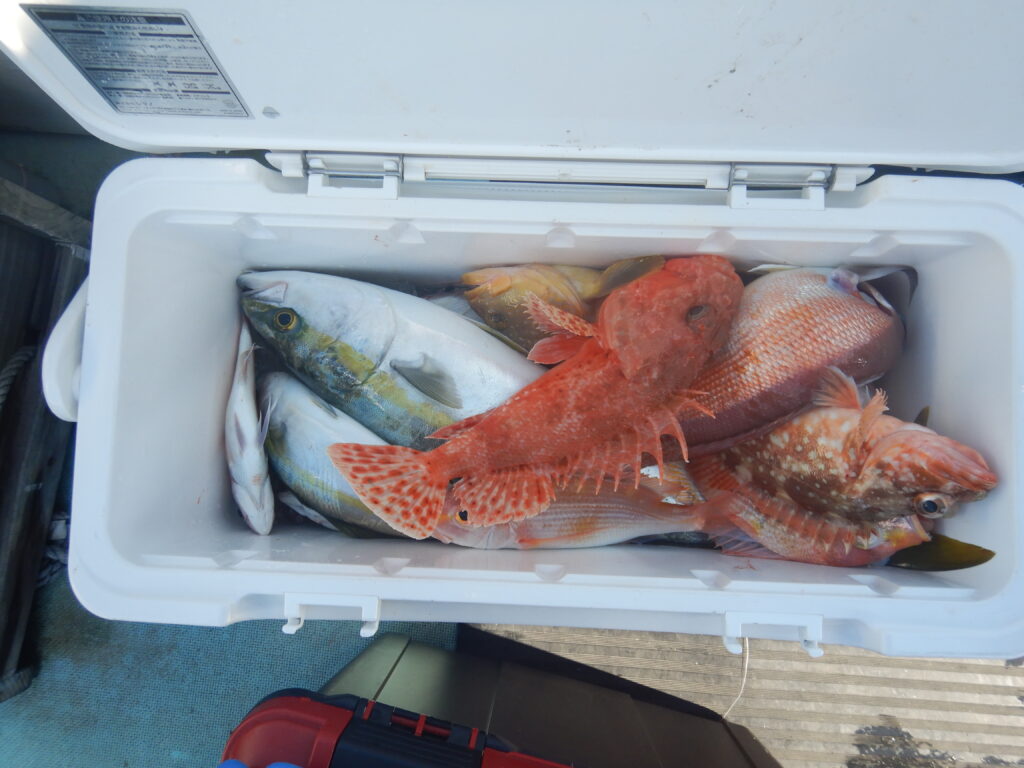 甘鯛(38㎝~48㎝)10尾 花鯛・真鯛(20㎝~40㎝)50枚 ガンド(61㎝)1尾 イナダ5尾 チカメキントキ(33㎝)1枚 カサゴ2尾 鬼カサゴ(32㎝)1尾 メバル1尾 ハタ1尾